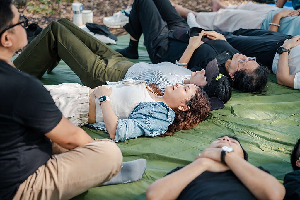 หลังจากเปิดความคิดเราจึงชวนเพื่อน ๆ มาร่วมกันหลับตาผ่อนคลาย ใต้ต้นจามจุรีใหญ่ ขนาด 10 คนโอบ แลนด์มาร์ก อันแสนร่มรื่น พักผ่อนเปิดสัมผัส ชวนหายใจช้า ๆ ได้ยินเสียงใบไม้ไหว และหัวใจของตนเอง
