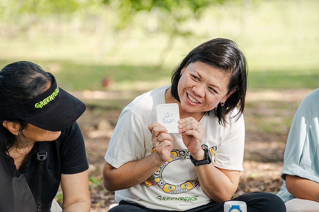 ช่วงท้ายของกิจกรรมเต็มไปด้วยความอบอุ่น เมื่อ พี่จิ้บ – อัญชลี พิพัฒนวัฒนากุล (ผู้นำทีมรณรงค์กรีนพีซประเทศไทย) และ พี่วิภา – วิภา สุวณิชย์ ผู้บริจาคที่ยืนหยัดเคียงข้างกรีนพีซมาเกือบ 20 ปี ได้มาร่วมแบ่งปันความประทับใจ