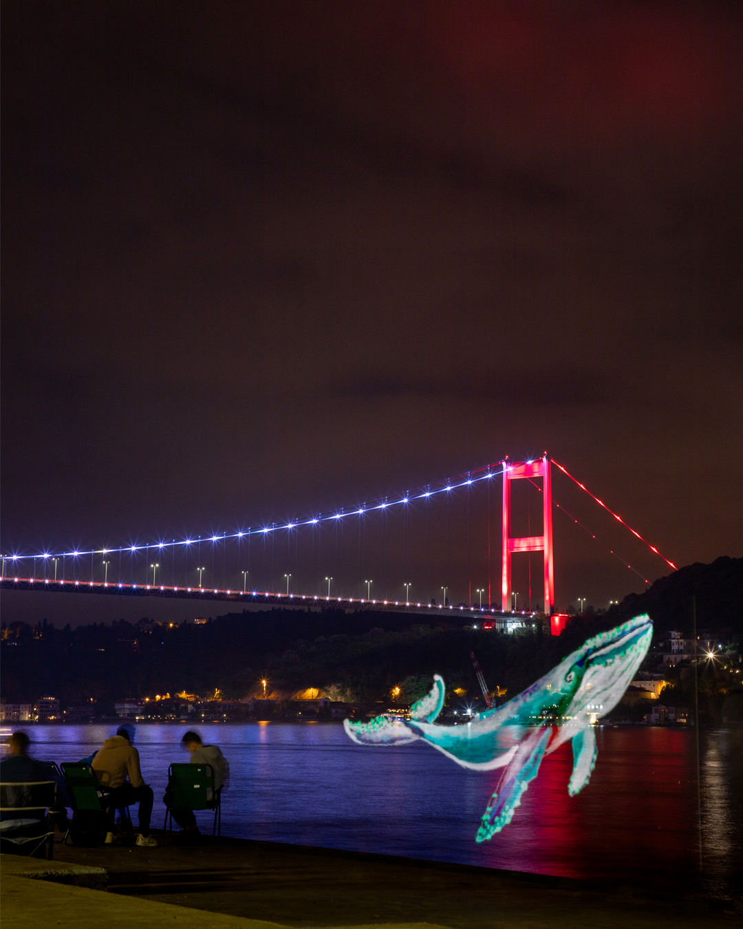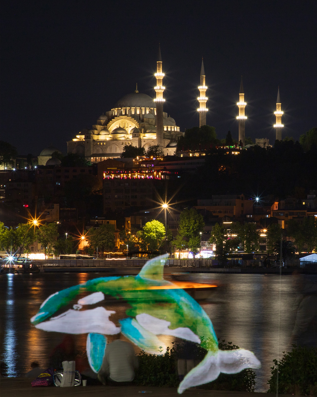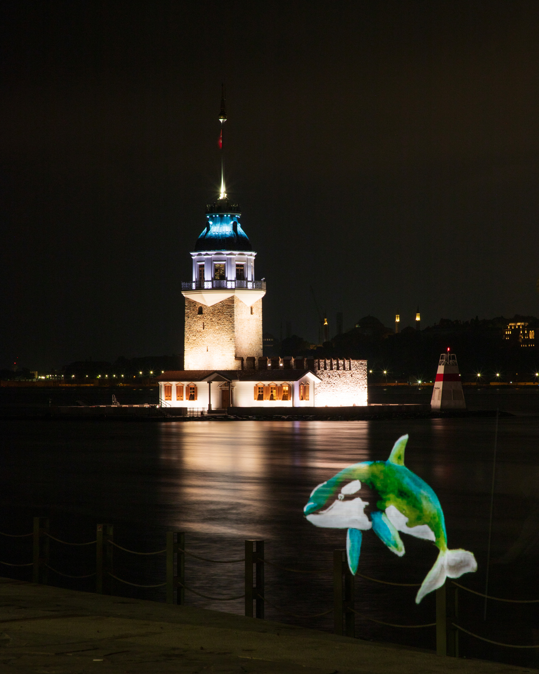 İstanbul Boğazı’nın gece manzarasında ortaya çıkan balinalar, yunuslar ve vatozlar Küresel Okyanus Antlaşması’nın onaylanması çağrısını görünür kılmayı amaçladı.