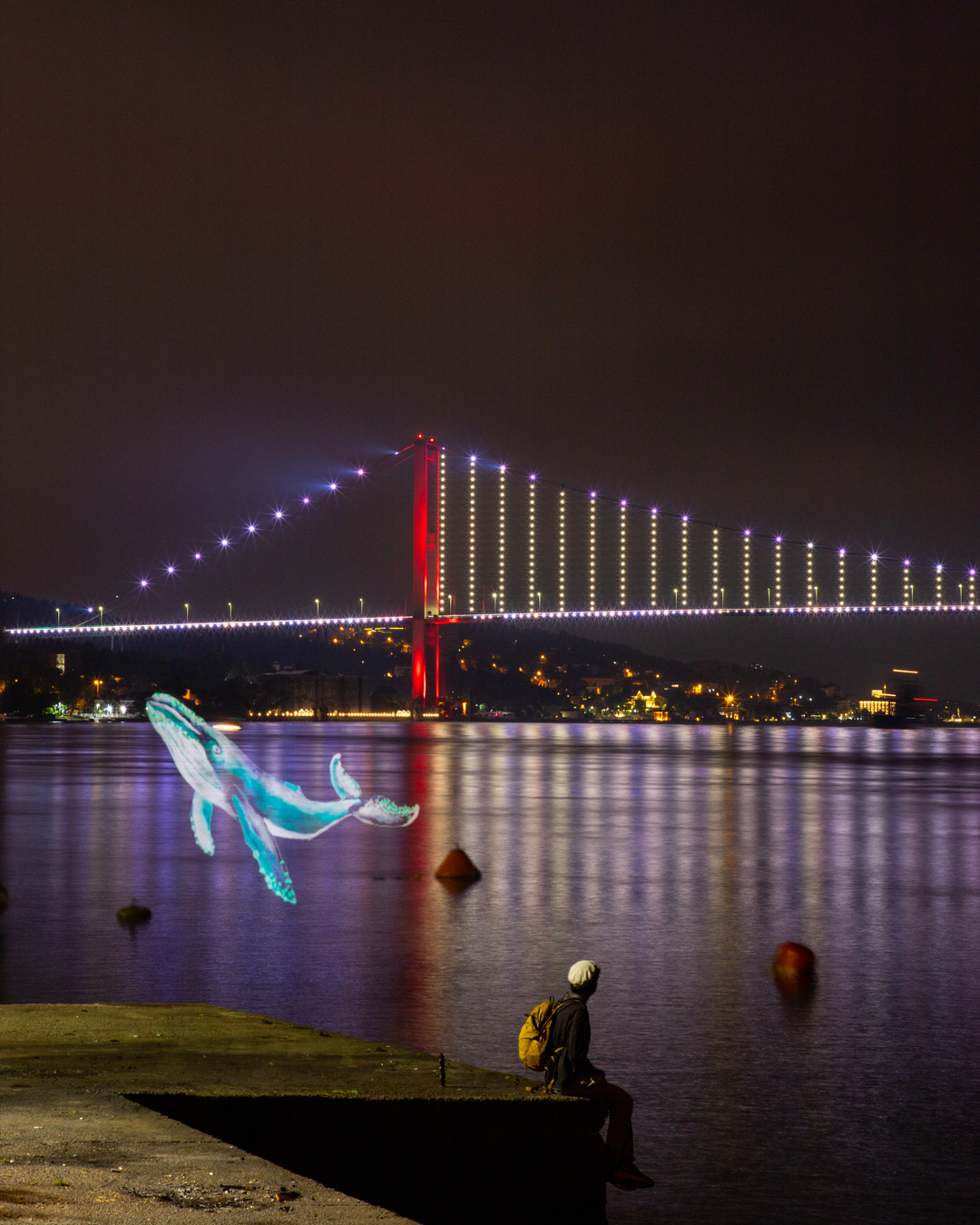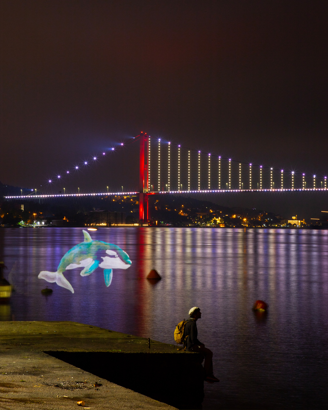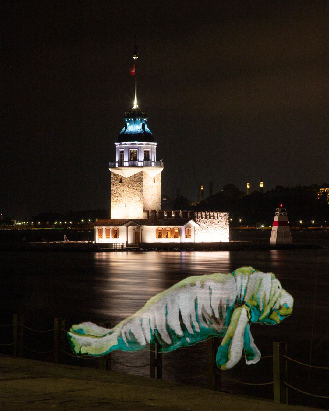 İstanbul Boğazı’nın gece manzarasında ortaya çıkan balinalar, yunuslar ve vatozlar Küresel Okyanus Antlaşması’nın onaylanması çağrısını görünür kılmayı amaçladı.