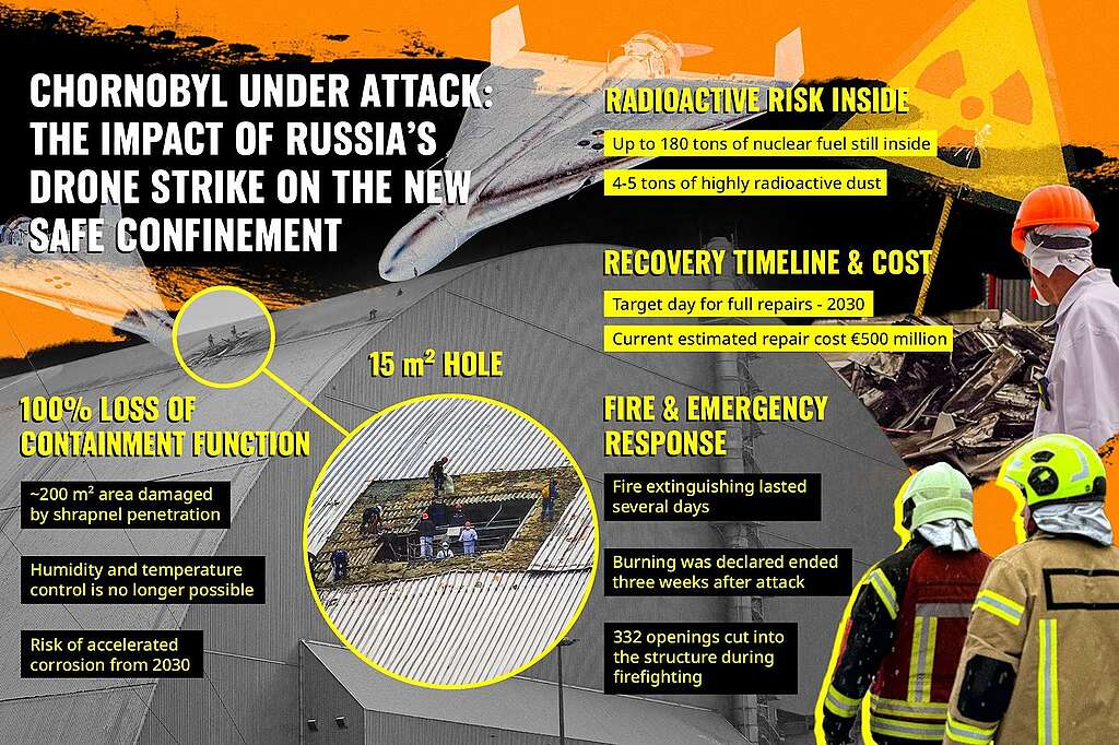 The destruction was caused by a Russian drone attack last year. The ruins of reactor 4 and the Sarcophagus are contained inside the NSC. The Sarcophagus is required to be dismantled as soon as possible but the damage to the NSC means it cannot. Without urgent repairs to the NSC, the Sarcophagus is at increased risk of collapse, a new report from Greenpeace Ukraine finds.