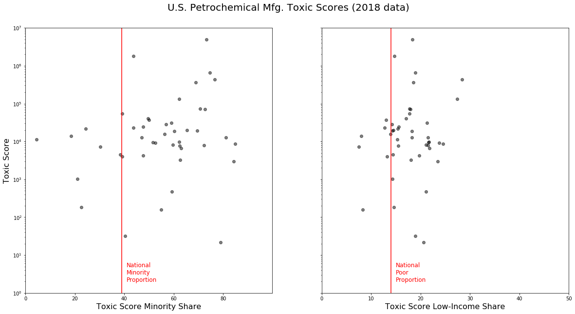 Figure 7: Minority (left) and low-income (right) shares plotted against total toxic score (on a logarithmic scale) for 48 petrochemical facilities. The red lines represent the 2018 national proportion of minorities (39%) and poor people (14%).